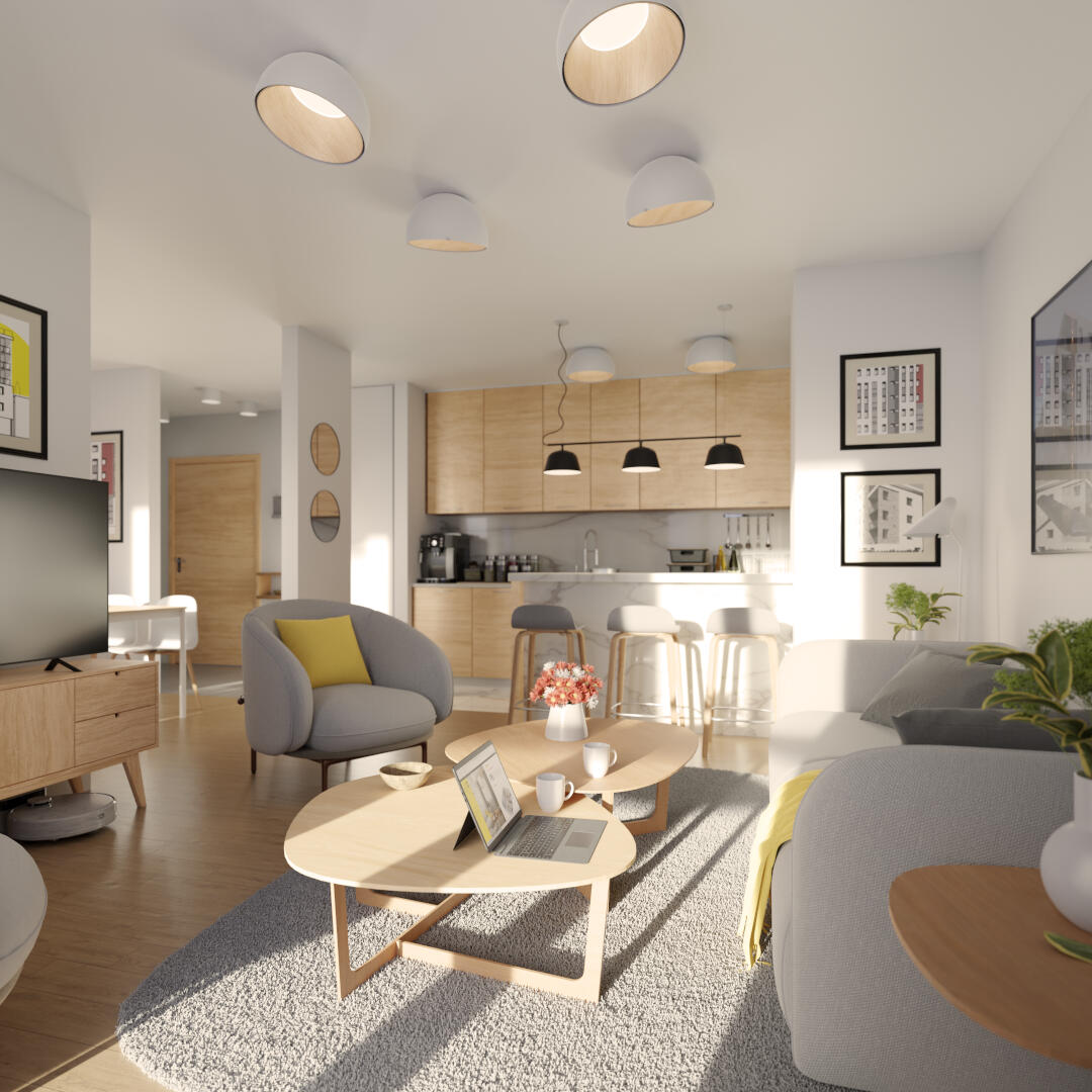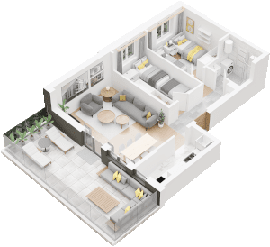 Trosoban stan od 70,72 m² orijentisan je dnevnom zonom ka zapadu, ugaonom terasom ka severozapadu, i noćnom zonom ka severu. Udobna dnevna zona sa delimično pregrađenom kuhinjom je otvorenog tipa i povezana sa hodnikom. Pored kupatila, stan raspolaže i gostinjskim toaletom.